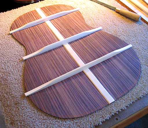 Here's the back, with all the braces and the back joint reinforcement strip all shaped and sanded down: