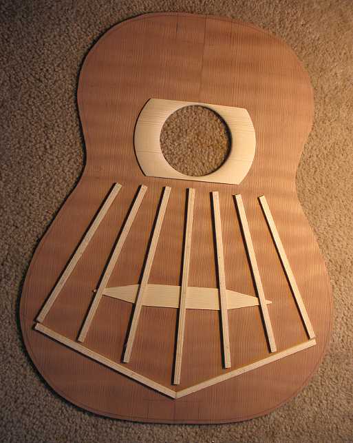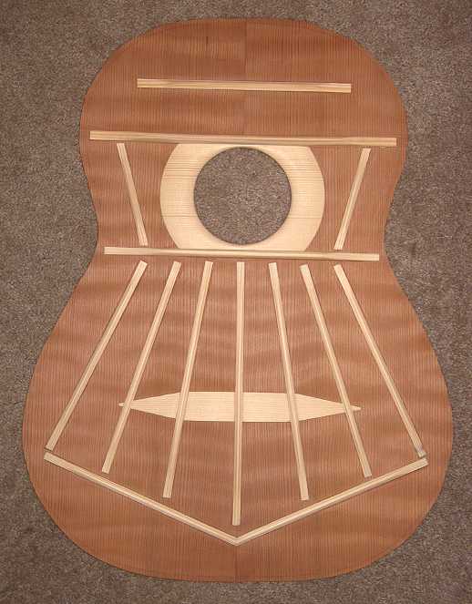 O.K. ---- I lied. I couldn't resist finishing it up. Here's the final product --- the top all braced, braces shaped and sanded. I tapped the top, and it seems to have the tone of "D". Does that mean anything significant? I don't know. But it is kind of nice that it seems to have a definite "tune".... Tomorrow, I think I'll start on the sides.