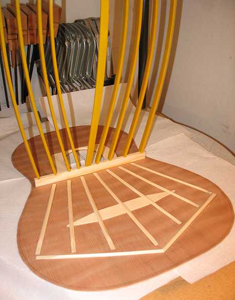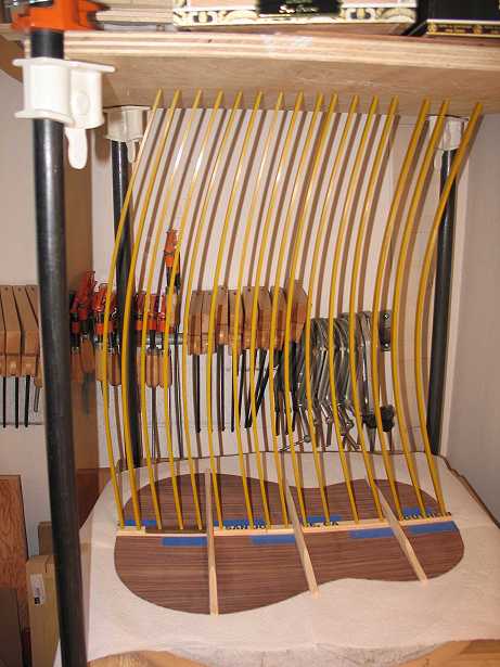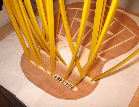 After I'd finished shaping and sanding the back braces, I removed the top from the go-bar deck. Here it is, with the fan braces all glued:
