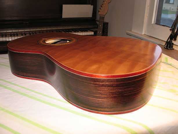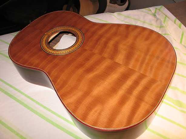 Sunday, September 30, 2007: Well, I'm back.... If you recall, I had finished the building the day before I left for the Healdsburg Guitar Festival (which was Thursday, August 16th) --- the festival lasted until August 19th -- I stayed the whole time -- decided to splurge a bit, and stayed in a step up from my usual Motel 6 --- a Holiday Inn Express!!! Very nice --- Internet DSL access, a fridge, microwave, coffeemaker, ironing board, blowdryer, nice linens, a little balcony --- even room service, if I wanted it (but I didn't -- too expensive!). Very nice breakfast bar, too. It made the stay up there very enjoyable. Saw LOTS of amazing guitars, lots of great mini-concerts & seminars, a great concert with a fantastic guitarist I'd never heard of before (Michael Chapdelaine), met up again with lots of guitarmaking friends --- get this, even got interviewed on film for some cable/Internet access film-making crew, who are trying to focus on community stories (have no idea if/when it will ever air anywhere, though). What I promised myself, though, was that I would NOT TOUCH THE GUITAR after I got back from Santa Rosa (where the "Healdsburg" Guitar Festival is held), because I needed to start doing some schoolwork planning. I was pretty good about that. I did, towards the end of the week, however, break down and start sanding the guitar, in preparation for finishing it. With school, it would just be too hard to do it in the regular way (spraying a finish), so I experimented and decided to do a "Tru-oil" finish --- it's actually gunstock finish --- an oil finish that you just wipe on with a cloth (after a seal coat of shellac, so the oil doesn't actually soak into the wood), then wipe immediately off, so there's barely a thin coat of finish left on the surface. Because it's oil, you can only put on one coat per day (it takes a long time to dry) --- and because it's so thin, you have to put on LOTS of coats (maybe 8-10 or more). But it's so easy to apply, it's something I could easily handle once school started. So that's what I did from August 23rd to September 3rd. I ended up putting on about 12 coats of the Tru-Oil. Then the hardest part came....the waiting. I told myself I would wait a full three weeks after the last coat was applied, before I touched the guitar again. I kept my promise (it wasn't hard, though, as school, which had started on August 28th, kept me really busy). The three weeks' wait time ended on September 24th, this past week. So...this weekend I did the polishing. All I did was use (dry) my Micromesh sanding cloths 6000, then 8000, then 12000 grits. Then I used Meguiar's #9, then #7, and finally #10.