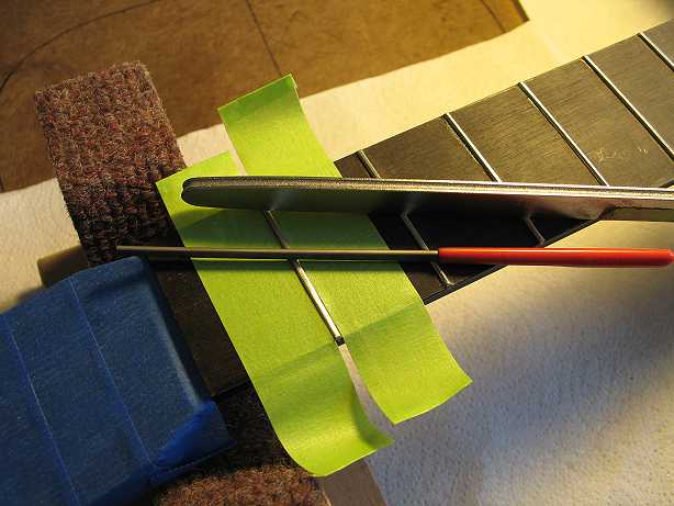 Saturday, October 6th, 2007: Today I spent about an hour or so leveling, crowning, and polishing up the frets, and cleaning up the fingerboard surface. Below are the two tools I use to crown the frets and round the fret ends. After I did all that, I used 400 wet/dry sandpaper, then 600, and finally the white 3M synthetic steel wool (equivalent to 0000 steel wool). Then I did a final sanding of the ebony fingerboard and put some lemon oil on it.