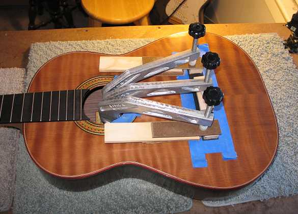 The next thing I did was to figure out exactly where to place the bridge. Most sources I found seemed to say that 2mm compensation is about right for a 650mm classical guitar, so that's what I did. I located the bridge so that the front of the saddle slot was at 652mm from the nut. Holding the bridge in place with a few layers of masking tape against its corners and edges, I scribed the bridge outline with an Exacto knife. Then I used some Zip-Strip paint stripper to remove the finish, scraped it carefully away with a 1/2" chisel, wiped the scraped surface with water (to neutralize any remaining stripper residue), and set it aside to dry. While it was drying, I made a few cauls for the top of the bridge.