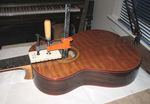 Today (Sunday) I prepared to glue on the neck. First, I had to make a couple of cauls for gluing on the fingerboard extension. Then I bolted the neck on and used my Exacto knife to carefully scribe around the fingerboard extension. I removed the neck and then used paint stripper to remove the finish within the scribed lines. After very carefully scraping off the bubbled finish with a 1/2" chisel, I wiped the area with a dampened paper towel, to neutralize any possible remaining stripper residue, and set it aside to dry. After about 15 minutes, I put glue on the fingerboard extension, bolted the neck on, and applied the cauls and clamps, as you see below.