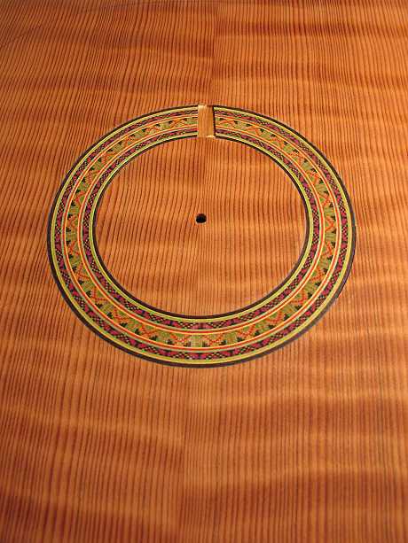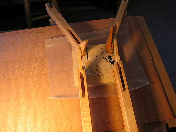 Here I am clamping down the glued rosette (glued with Titebond) with a block of wood. |