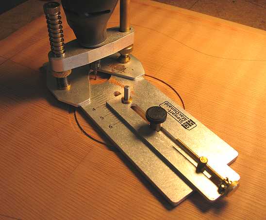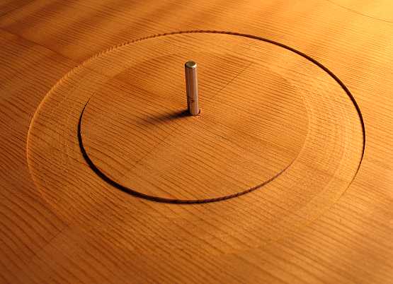 After some test routs on scrap wood, I used my Dremel and circle cutter to rout the channel for the pre-made rosette I had purchased. I used a 1/16" inch downcut spiral bit (instead of a larger bit) because it seemed to cut much more cleanly. I just made many, many cuts, until I had the proper width for the rosette ring. I cut a channel about 1/16" deep. |