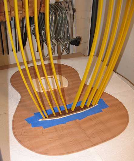 Thursday, July 26th, 2007: After scouring the Web (mainly the MIMF and Official Luthiers Forum sites), I finally decided how to go about bracing my classical. I will use the 25' radius dish for the bracing from the cross brace just below the soundhole on down, and will glue the braces above that flat. I will use my 15' radius dish for gluing on the back braces. So, the first thing I did today was to glue on my bridge pad, using my go-bar deck: