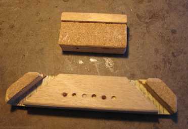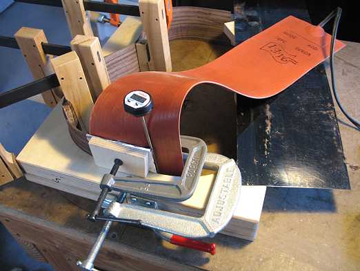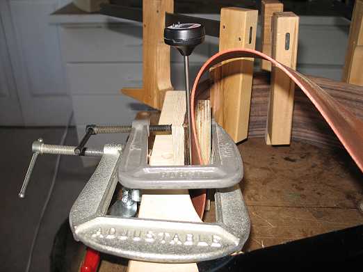 SIDE CUPPING!!!! Oh, no!!! OKAY. . .my first real mishap on this guitar . . . After I took the first side out of the bender, what I discovered was that about 3 inches of the lower bout end of the side had cupped. I think it was not able to contact the heating blanket fully, and the moisture made the wood cup. It was too big of a cupping to just press it back to shape. After thinking about it a while, I decided to try using the heating blanket, with the side clamped in the body mold, to make it conform to the mold. I wrapped the wood with some dampened Kraft paper and foil, laid the heating blanket on the inner side, and clamped it against the mold, with another clamping caul for the portion sticking up above the mold. Then I turned on the heating blanket and cycled it on and off a couple of times. It seems to have worked! When I removed the heating blanket, after it had cooled completely down, I saw that the cupping was gone. I'm leaving it in the mold till tomorrow, just to make sure it really sets. SPREADERS AND CAULS While the second side was in the bender, I used the time to make some spreaders for the mold. I found I had an old one that would work for the upper bout. I ended up making one for the waist and one for the lower bout. I also scrounged around to see if I had any of my old clamping cauls for gluing up the bridge and the fingerboard extension. (I wanted to make sure I didn't forget to make these before I closed up the soundbox! I did that once and had to make the cauls just going by the blueprint, hoping it would fit properly in the end!) I did find them, and cut them down a bit, to make it easier to get them in and out of the small soundhole of this guitar. |