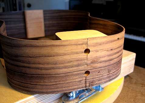 Tuesday, July 7th, 2009: It's around noon right now, and, while I wait for the kerfing I just glued on the top edge of the sides to dry, I will let you know what I've done so far this morning. Below you can see I've drilled the bolt holes through the sides (drilling from the inside of the block). This is the easiest time to do this.