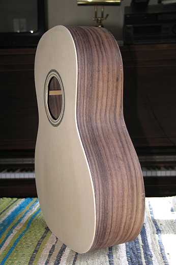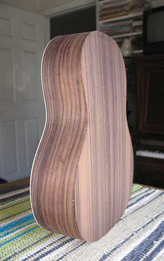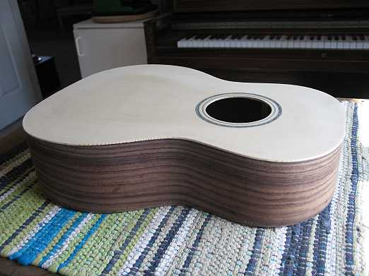 WE NOW HAVE A SOUNDBOX!!! YAY!!! Here are a few quick photos. When I thump the top now, it sounds like a C# note! (And the back thumps to the same note.) Now it's on to measuring for the binding and purfling channels, bending my binding, and routing the binding/purfling ledges (gulp!). I plan to use the same bloodwood binding I used for my classical two summers ago.