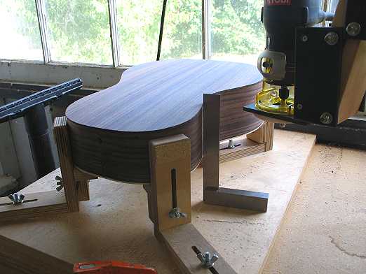 Friday, July 10, 2009: Yesterday, before I left for the Ed Gerhard concert, I discovered I needed to modify the holding cradle (seen below) for the smaller size of this guitar. (It just involved drilling new holes on the base to place the standing bolts in new locations.) Below, you see me checking to make sure that the guitar body's sides are set so they're perpendicular to the base. I have a flush-cutting bit with a roller bearing in the laminate trimmer of my router jig. I just finished using this jig to trim the overhang of the top and the back.