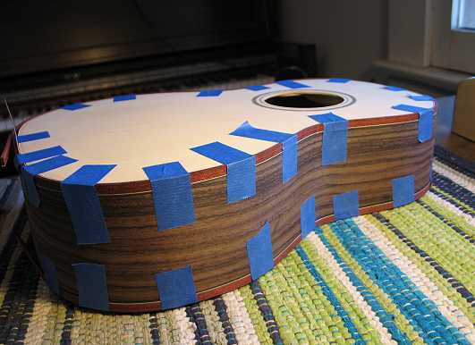 Below are a couple of photos of how it's going to look. After taking the bindings out of the bender, I have just taped them (dry) into the ledges, just to see how they fit and to hold them there till tomorrow, when I will work on it further. Tomorrow, I will first make my end wedge — actually, not a wedge, but just two of the bloodwood bindings glued together (with the purfling on the outside). I think I'll miter the side purflings to the wedge strip purflings. After that's done, I'll glue in the bindings and purflings with Titebond. That's enough for today. I can relax now. (Routing binding channels always stresses me.)