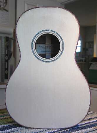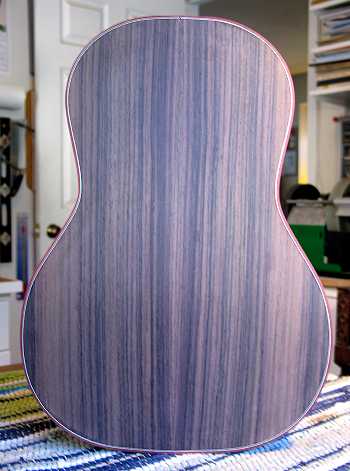 Sunday, July 12th, 2009: An exciting day today!!! THE SOUNDBOX IS FINISHED!!!! This morning I removed the tape from the bindings on the top. When I got home from church, I first did my weekly challenge, the Sunday New York Times crossword puzzle (keeps my brain working), and then I began the task of scraping and sanding down the bindings. It turned out I was very lucky this time!!! When I first looked at the bindings, right after removing the tape, it looked as if I had some gaps between the binding and the purfling on the upper bout of the back. However, after I scraped all the bindings and purflings down, it turned out that there were no gaps! I guess what I thought were gaps was just the black line of the purflings kind of smashed down, before scraping, making it look like black space there. So...no gaps to have to deal with this time. YAY! It took me around 3-1/2 hours to do all the scraping and sanding, so the bindings were flush to the body (in some places, my bindings were a bit proud of the sides, and that takes longer to scrape down than where they're proud of the top or back). I think it came out nicely! Here are some pics: