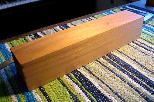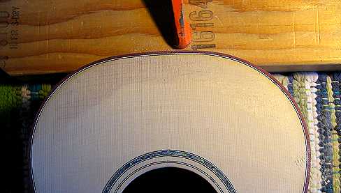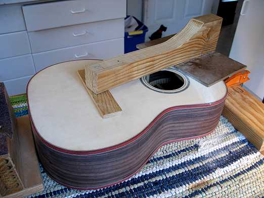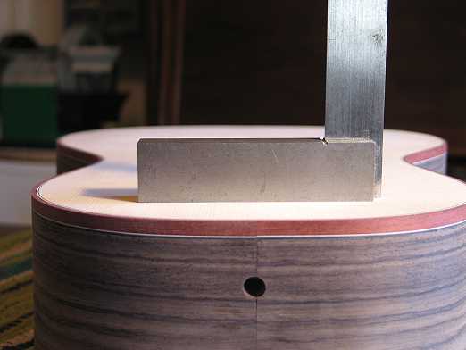 Monday, July 13th, 2009: Now that the soundbox was done, I needed to do a little bit of sanding on the upper bout, to remove some of the slight arch that was introduced when I mistakenly glued the flat upper face brace while it was sitting in the radius dish. (I should have glued it on a flat surface.) Here I have a sanding paddle the thickness of my fingerboard, pivoting on top of a wood strip the thickness of my bridge. I simply swing the paddle (120-grit sandpaper is stuck to the bottom of the paddle) back and forth, until the pencil marks I have put on the upper bout have disappeared.