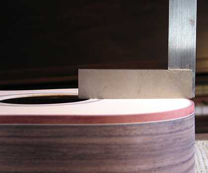When the sanding is all done, you can see that the upper bout area is now flat both vertically and horizontally. This way the fingerboard extension will be able to sit flat upon the upper bout, instead of being thrown off by the radius arch of the top.