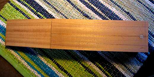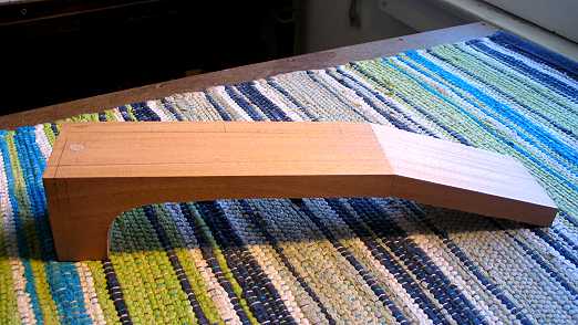 Finally, today I also routed out the slot in the neck for the single 1/4" by 3/8" carbon fiber rod I will install in the neck, in place of a truss rod. It will give the neck strength and stability, without the weight of a truss rod, which is probably unnecessary in a neck as short as this. To rout out this slot, I used this jig, which I've used before. (Truss rod jig 1, 2, 3) I have epoxied the carbon fiber rod in, which I will scrape down tomorrow (and will have photos of tomorrow). |