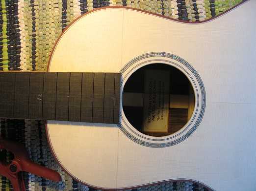 Wednesday, July 15th, 2009: Well, today was kind of a "hodge-podge" day. I did lots of little things concerning the neck, interrupted here and there with another thing that was going on at my house — for a large part of the day, I was checking on the tree trimmers who were working in my yard. But, despite that, I was able to get a lot of little things done today. Below you see that I have trimmed the neck blank flush with the peghead overlay. (I used my Robo-Sander to do that.) I have also marked for thinning the peghead (1/2" thick), which I will do tomorrow.