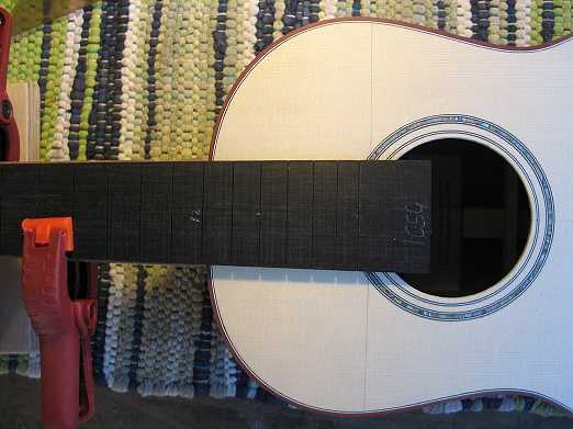 Another thing I did was to determine where to cut off the fingerboard. I have marked the top where I want the fingerboard to end. Now I can mark where the fingerboard meets that pencil line, and cut the fingerboard to that line.
