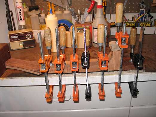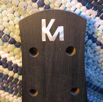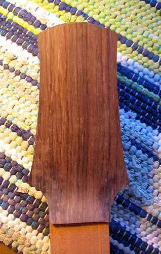 The next thing I ended up doing was to make a "backstrap" (I just learned today that's what you call it) — a veneer overlay on the back of the peghead. Some people do this for looks, others to thicken up a somewhat too-thin peghead. The latter was my reason. In sanding the back of the peghead, I had sanded it a little too thin, about 1/16" too thin. It would have been okay, but the more I looked at it, the more I wasn't happy with it. So I bent a piece of rosewood to match the curved volute I had already sanded into the back of my peghead (bending it to match was no easy task!), glued it on, and trimmed it up. Here it is: