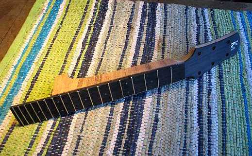 Sunday, July 19th, 2009: Well, I have to admit — I spent a bit of time today procrastinating the next step. I was nervous about sanding the volute into its rounded shape. I've never had any real problems with it the few times I've done this so far, but, for some reason, it still always makes me very nervous. I keep thinking I'm going to slip and oversand or move it a little too much as I use the belt sander to round out that volute — and that I might end up sanding too far into the nut area — and then I'd mess up the all that work I've put into the neck so far. So...this morning I procrastinated. But it came out okay! I just took a deep breath, prayed my eyes and my hands would work smoothly, and just did it. Here it is: