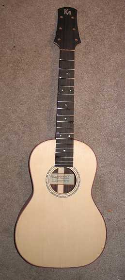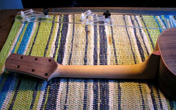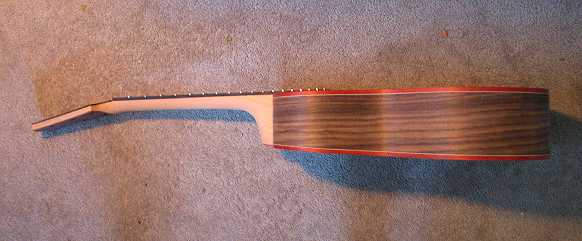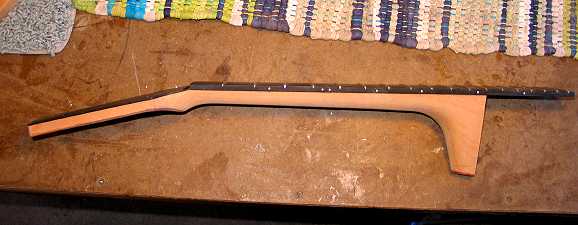 Monday, July 20th, 2009: Last night and this morning I carved the neck. I also cut the nut slot. Here's what it looks like now: