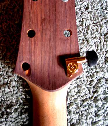 Tuesday, July 21st, 2009: OKAY. . . . So here's my major goof for this guitar . . . . Why do I only figure so many logical things out AFTER the fact????? Sigh . . . . . It turns out that, in designing my peghead, I hadn't thought about how close the tuner holes were going to be to the curved part of the volute, and how that would affect the placement of the particular tuning machines I was using. Two discoveries: (1) I hadn't counted on how the curve would be closer to the hole after I had added the backstrap (the tuners did fit before I added the backstrap) and (2) I should have waited to drill the tuner holes until after I had finished shaping the entire peghead. Duh! (I seem to have many "duh!" moments when building guitars.) Anyway, the part of the tuning machine that was causing the problem was the little part that extends out, which holds the little screw to attach the tuning machine. I couldn't change the curve of the volute (flatten it out a little), because that would thin out the backstrap on the bottom (and that would look weird). So . . . I decided to excavate a little bit of the wood, to make room for that tuner extension to lie a little bit lower. It looks crummy right now, but once the tuners are installed, you won't be able to tell (but I'll know).