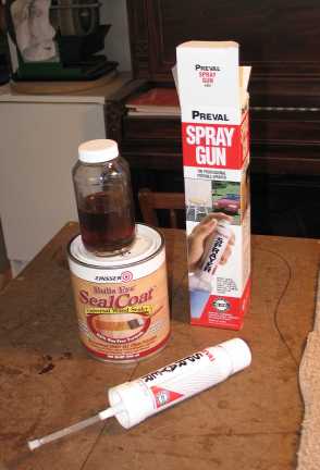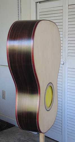 Friday, July 24th, 2009: The first thing I did this morning was to very lightly scuff-sand the last thinned coat of Z-Poxy that I had applied yesterday, in preparation for the shellac sealer. I then used a PreVal sprayer to spray on a coat of Zinsser SealCoat shellac (it's a 2-pound cut of wax-free shellac). I waited over an hour for it to dry, then lightly scuff-sanded it, before spraying on a second coat of the shellac. SOMETHING I DID DISCOVER (not for the first time): I need to always be sure to do my level-sanding carefully (with a gentle hand, especially on the curves of the sides and neck). The reason I say this is that, in sanding the first shellac sealer coat, I did manage to sand through the Z-Poxy to the wood in one tiny (1/8") spot on the upper bout of one side. I immediately stopped, wiped some more thinned Z-Poxy over it, let it dry (actually, I ran a hairdryer over it briefly), and then went on to spray the second shellac coat. I scuff-sanded that second coat with a much lighter hand, and went on to spray my first coat of finish. All is well. No evidence of the sand-through!!! (I was relieved, because this was one particular aspect of using the slightly amber Z-Poxy that I had been worried about — the possibility of sanding-through and creating blotches in the final finish.) I will wait till that's dry, scuff-sand it lightly, and begin spraying on my topcoats. I will be trying out Target Coatings' new EmTech EM6000 waterbase lacquer. (It's the successor to the USL I've been using for the past few years.) Here's how the guitar looks presently (after the shellac sealer coats):