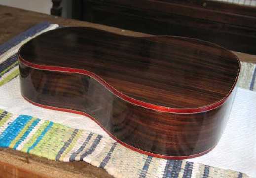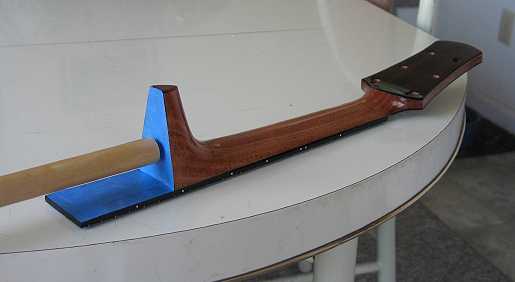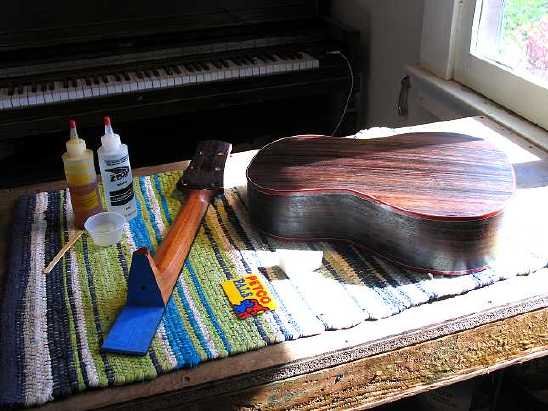 Wednesday, July 22nd, 2009: Last night I finished all the final sanding. Then I put a couple of coats of shellac (Zinsser SealCoat) on the top, both to protect it and act as a seal coat under the finish. This morning I began the pore-filling process. Before I began, though, I spent a little bit of time masking the fingerboard. I also taped some Kraft paper to the top, just for some added protection. I am using Z-Poxy to fill the pores. I use a credit card to mash the Z-Poxy into the pores and then to squeegee off the excess. (I highly recommend using a PetCo Rewards card — ha! just kidding — because it was more flexible than other credit cards I tried — it was able to flex better to conform to the curves of the guitar.) For the sides, I also used a foam makeup wedge. On the neck, I found it easiest to apply the Z-Poxy with just my finger (covered with a latex glove, of course). So far I've just put one coat on. Later today (it is recommended to wait at least 6 hours for the Z-Poxy to cure) I will level-sand it and then apply another coat. Usually it only takes two coats to fill all the pores. Here's a photo of what it looks like at the moment, after the first coat of Z-poxy has been applied: