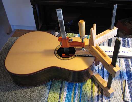 When it is dry, I lightly sand the area before applying Titebond to the fingerboard extension. I bolt on the neck and clamp it all up. That's where it is now.