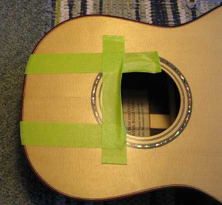 After that, I took a little break for lunch. Then I moved on to gluing on the neck. I first bolted on the neck, checked the fit of the neck again (it was still good!), and put masking tape around the fingerboard extension. I removed the neck, and put some paint stripper on the area within the masking tape. When I do this, I remove the finish with a 1/2" chisel, wipe the area with a dampened paper towel to neutralize any stripper residue, and let it dry.