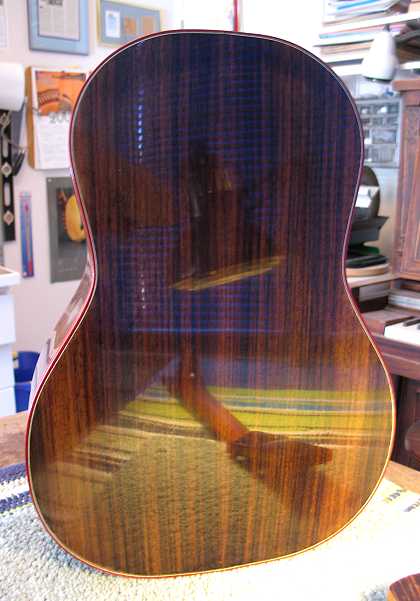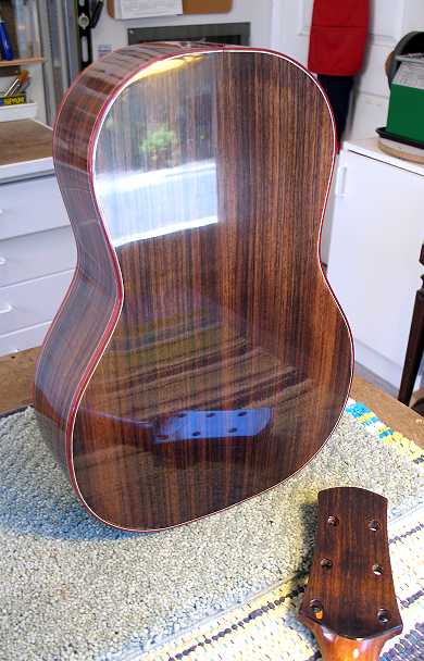 Monday, August 3rd, 2009: I'M BACK!!!!! YAY!!!! Well, today was the day I'd been eagerly awaiting — the day when I could finally "finish" the finish! It's been a week since I sprayed the last coat of finish. It pretty near killed me to wait, but I was good. I spent this morning rubbing out the finish. What I ended up doing was first leveling the finish with P600 grit gold sandpaper. Then I dry-sanded with Micromesh, from 1800 to 12000. (Previously, on all my guitars, I have wet-sanded with the Micromesh, but I'd read on various forums that this new EM6000 finish sometimes does better with dry-sanding, so I decided to try it.) I think from now on, I will dry-sand, instead of wet-sand, as it went just as easily (and it's a lot less messy). I did happen to sand through a couple of places on the binding, but all I did was to put a few thin coats of the EM6000 on the little sand-through spots and, a little while later (it didn't take long for the coats to dry), I just used some Micromesh to sand and polish them up again. After that, I used the buffer (I have a Caswell Plating 1100 RPM buffer that I got a few years ago for only $99!) and some Menzerna fine compound to buff the guitar. Finally, I polished it up with Meguiar's #9 (swirl remover), #7 (deep glaze), and #10 (plastic polish). To be honest, I wasn't really sure what was the best polishing procedure to use — I went on the different forums and found that different people all had different methods — so I just did what I did. It seems to have worked out nicely: