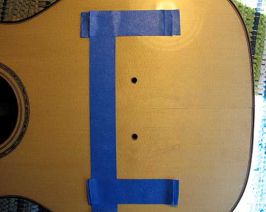 I put a few layers of masking tape around the front and sides of the bridge, scribed around the back end of the bridge with an Exacto knife, and, with the bridge still taped down, drilled holes through the 1st and 6th bridge pin holes. After that was done, I again used paint stripper to remove the finish underneath the bridge position. I put stripper almost up to the outline of the bridge, scraped it away with a 1/2" chisel, wiped it down with a dampened paper towel, and, when it was dry, lightly sanded it.