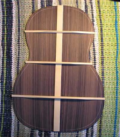 The next thing I did today was to sketch out the bracing plan on my top, stupidly forgetting that it will be all sanded away later, after I put the rosette in and thickness-sand the top to its final thickness!!! (I've made this mistake before.) Oh, well — no big, big deal, as it still gave me something to check my braces against.