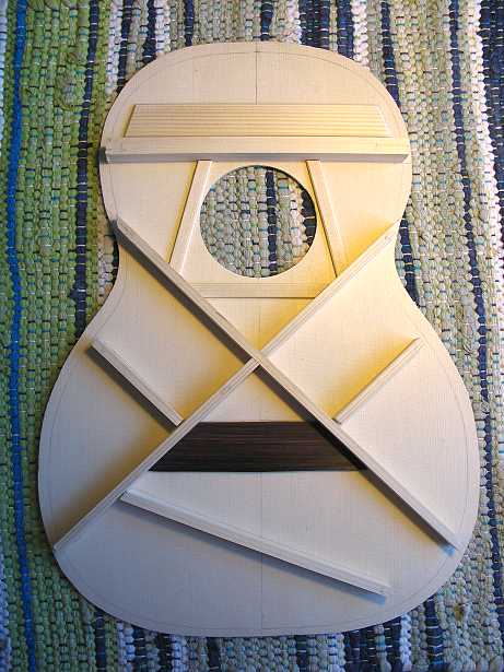 Here I have cut all the braces to their final lengths. I have also made a rosewood bridge plate (3/32" thick).
