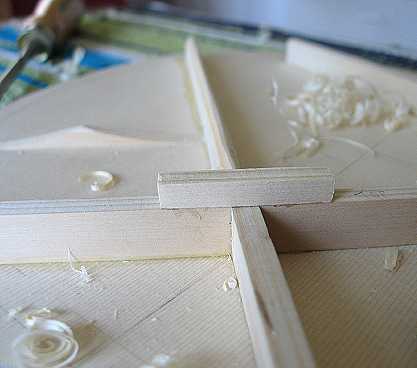Here I have glued a strip of spruce to cap the X-brace intersection.