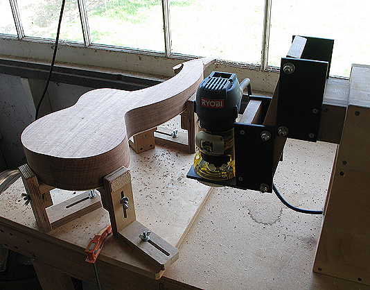 Still Saturday . . . . It's about 4:00 p.m. right now, and I've just finished trimming the overhang and flush-routing the soundbox. It took me longer than I expected! Before I used the binding router jig to flush-rout the overhang, I trimmed the bulk of it with my mini-drawknife. I love this tool! I bought it 14 years ago, and I've never had to sharpen it once! For some reason, it keeps its edge. I have both the straight one and the curved one, but I find I tend to use the curved one the most; it's somehow easier to use to get into all areas. Then, what took the longest time (even longer than the actual routing) was setting up the soundbox in the holding cradle that I use with the binding router jig. It's basically set up for guitars, and, when I started building ukuleles, I found I had to add a few holes in different locations to position the holders for the ukes. With the odd shape of this instrument, I had to add another hole and reverse the orientation of a couple of the holders, to be able to hold the harp ukulele securely. All that took a bit of time. Anyway, I was pretty lucky this time; all my sides were absolutely perpendicular to the soundboard, so all I had to do to set it up was to have the same measurement all around from the bottom of the cradle to the soundboard of the uke. Here's a photo of the set-up: