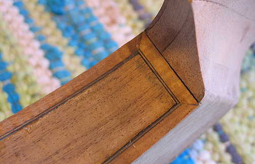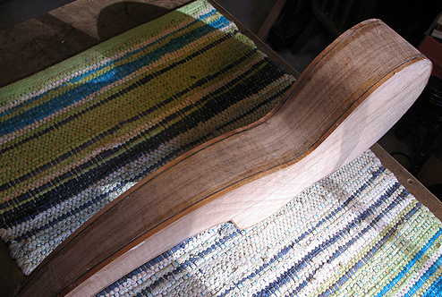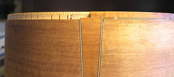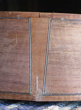 Wednesday, June 22nd, 2011: As soon as I got up today, I removed the masking tape from that first edge I bound yesterday. Here are some quick photos of the results (before any scraping of the binding): Here's the end wedge and how the mitering of the side purfling went: