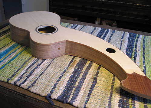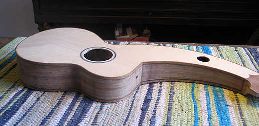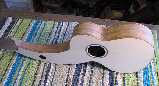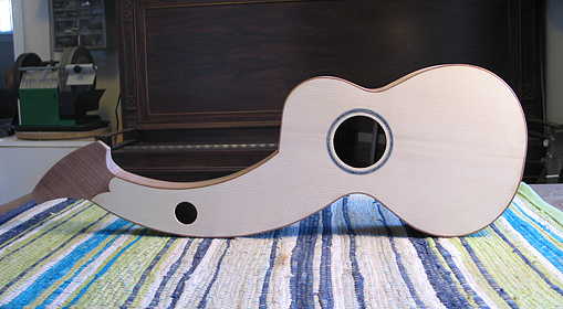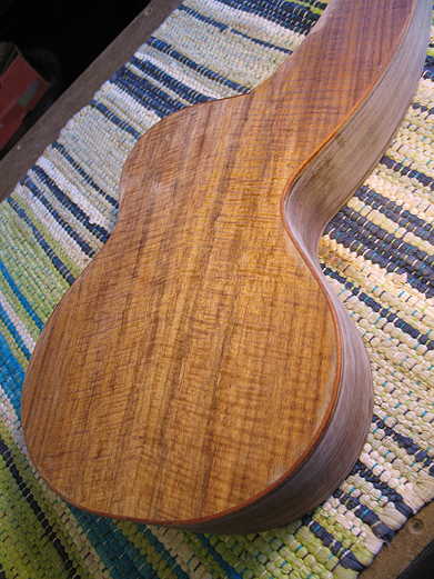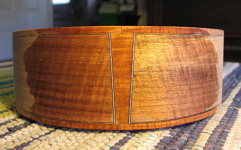 Stay tuned. Today I plan to finish the rest of the binding!! Still Wednesday, about 5:30 p.m.: Only one photo of today's work — it took me around 6-7 hours today to do the rest of the binding. Much of the time was spent fitting and repeatedly checking the positions and angles of the various miter cuts (at the peghead end of the harp box sides and at the end wedge area). I did get better at bending the curly koa bindings, though, once I figured out that it bent much better if I used little or no water to dampen the strips. When I used water, the strips were more prone to crack along the flame lines. I only ended up wasting one binding strip; it cracked all the way through and so was not salvageable. Here it is, all taped up. I'll probably remove the tape later tonight, just before going to bed, and let it air-cure overnight. Then, tomorrow, I can scrape down the bindings and purflings and fill any gaps.