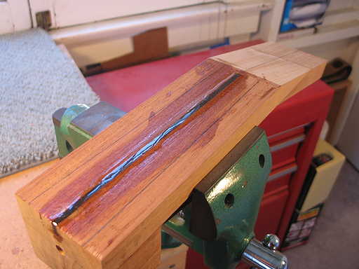 Saturday, June 25th, 2011: So far today I have routed the slot for the carbon fiber rod I will put in tbe neck, and I have glued it in with epoxy: