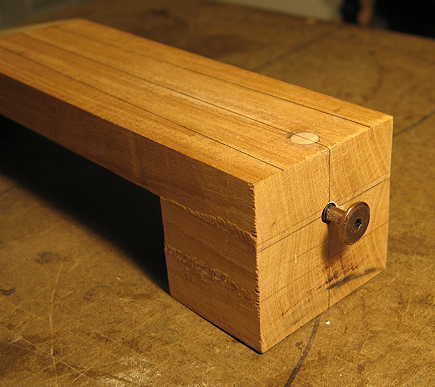 Finally, here is the neck blank all laid out. I drilled a 25/64" vertical hole about halfway down, for the barrel nut, which is about 1" tall. Above the barrel nut, I have glued a short length of dowel to plug up the hole. I also drilled a 5/16" horizontal hole for the furniture bolt's access to the barrel nut.