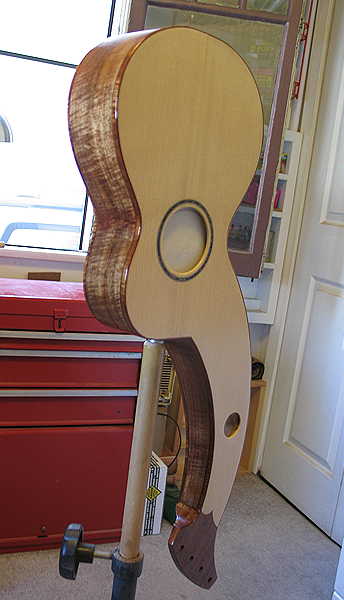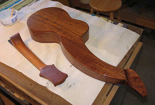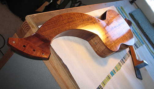 WELL, THAT'S ALL, FOLKS!!!!! No more coats to spray!!! I am so happy with how the finish went on — I think I have my technique finally figured out, so that the coats all leveled out nicely after each spraying application. I had no runs or sags except for that single one on Monday, after the very first coat. Now comes the most EXCRUCIATING part for me: the waiting for the finish to cure!!! The EM6000 requires a minimum of 100 hours to cure — longer is better. So, a week would be a good amount of time to wait. That will mean that I could possibly get to the final steps next Wednesday or so — rubbing it out and polishing it, gluing on the neck and bridge, leveling and polishing the frets, making the nut and saddle, installing the tuners and endpin, and stringing it up. Who knows....I might have it ready in time to take with me on July 19th, when I leave for the GAL (Guild of American Luthiers) conference in Tacoma, Washington!!!! That would be so cool! Oh, yeah — and I need to start looking around for some sort of case or gig bag that would fit this weirdly-shaped instrument!!! CHECK BACK AFTER NEXT WEDNESDAY, JULY 13TH!!!!!ACTUALLY — I LIED. LOOK ON THE NEXT PAGE IF YOU WANT TO SEE SOMETHING I DID IN THIS "WAITING" PERIOD!!! |