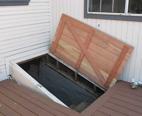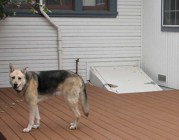 Friday, July 8th, 2011: Since I have to wait until next Wednesday before I can get back to the harp ukulele, I decided to work on something that I've been intending to do for a long, long time — make a new bulkhead door (my door leading to the basement). The old one was just a big, heavy 1/2" sheet of plywood, and, over the years, it had started to rot away. With Hannah here now, I wanted to make sure that (1) she wouldn't be able to continue chewing away at the broken section, and (2) she wouldn't be able to break through / get stuck / or get hurt. Here's the old door (with my former dog, Emily, posing nicely beside it):