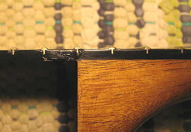 BAD NEWS #1 (and, hopefully, there won't be a #2):In buffing out the neck, somehow I managed to let the wheel catch the fingerboard extension (not quite sure how it happened, as I was being super-careful about how I did it), and it broke the extension off at the 12th fret (where it extends from the heel). YIKES!!!! I was, to put it mildly, a bit upset and heartbroken. After fussing and panicking for a few minutes, I finally calmed down enough to look at the damage. Luckily for me, the break was fairly clean. It was kind of an angled break, starting from the fret slot and angling down, which was probably better for gluing it all back together. I retrieved the fret, which had flown off to the side; it still had chips of the fingerboard stuck to one side. I thought for a while, and figured, this might be repairable. (I really, really, really did not want to have to either remove the damaged fingerboard from the neck and redo it, or have to make an entirely new neck and fingerboard!!!) The first thing I did was to hold the fret against the fingerboard, along its slot, fitting the tiny chips stuck to the fret into their tiny cavities in the fingerboard. As I held it there, I dropped some superglue along the fret, so it would wick into the break and hold the fret there. Then I mixed up some 5-minute epoxy, applied it to the broken-off fingerboard extension, and glued it back onto the fingerboard. I turned the neck upside-down, put some waxed paper and a wood block over the fingerboard extension, and clamped it down flat atop my workbench. After about an hour, here's how it came out. (In the picture to the right, it looks as if there's a chip out of the edge of the extension, but there isn't, thank goodness.)