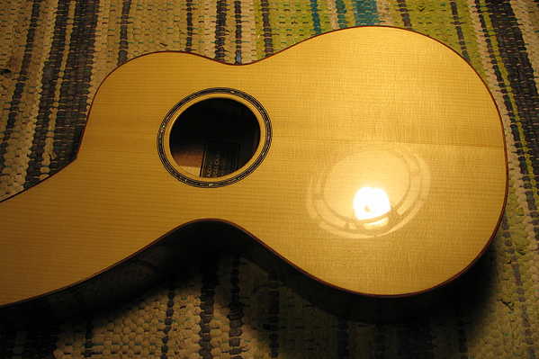 GOOD NEWS #2:I successfully dry-sanded (with Micromesh) the harp ukulele (and all those gaps you saw in the photo on the previous page were filled and leveled). Then I did the final polishing of the body on the buffing wheel. Here it is: