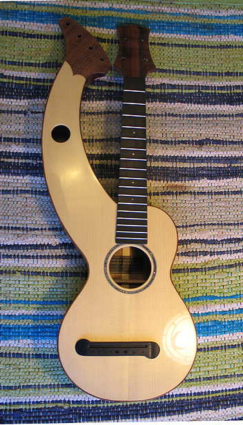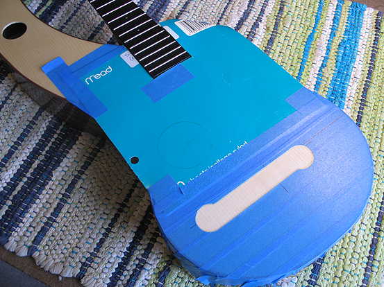 The next thing I did was to sand the white marks off the bridge and polish up the bridge on the buffer. I put double-sided tape on the bottom of the bridge, placed it in its position (masking tape still on the top), and drilled through two of the 1/16" bridge string holes, for positioning pins (1/16" brads). After that was done, I removed all the masking tape and cardboard masking from the top. I put glue on the bridge and the top, set the bridge on the top using the two positioning pins, and held it there for a few minutes until the glue set somewhat. As I held it there, I used a damp paper towel to remove glue squeeze-out.