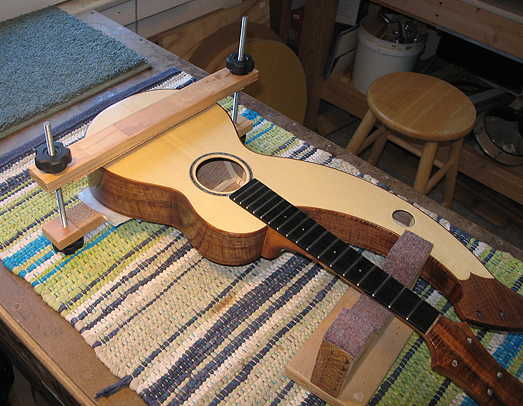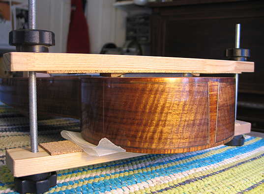I then removed the pins. Using the same simple clamp that I used last summer for the baritone uke, I clamped the bridge. As you can see below, I have placed two little blocks to put pressure on the wings of the bridge. The waxed paper on the bottom is there so that the cork will not possibly imprint itself into the back with the pressure of the clamp.