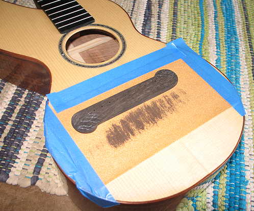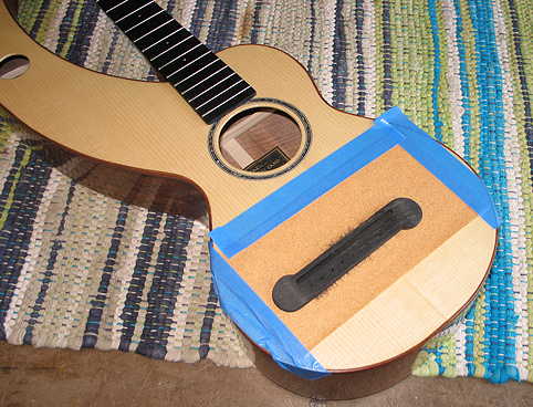I then stuck some double-sided tape on the bridge, set it in its position, and scribed the bridge's outline through the masking tape. Using the same orange Safe-Stripper that I used yesterday for the fingerboard extension, I removed all the finish just inside the bridge's outline. It took me a couple of applications of the stripper to get it really clean of finish. After I had scraped away the finish, I wiped it lightly with a dampened paper towel, let that dry, and then lightly sanded the area. Here you see the finish removed: