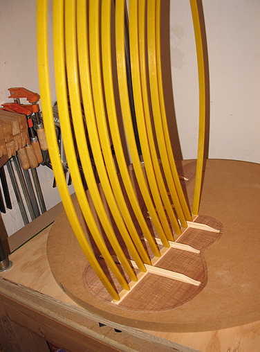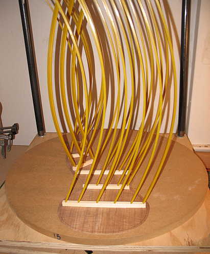 I drew the bracing plan onto the back, cut out the spruce braces, and sanded the 15' radius onto the bottoms of the braces. Here I'm gluing the braces on in the go-bar deck: |