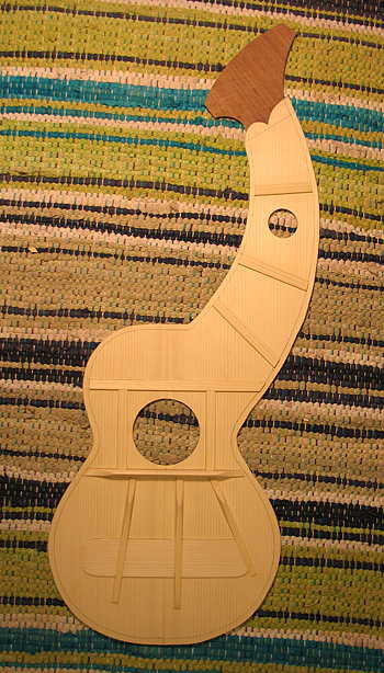 Sunday, June 5th, 2011: Today I thickness-sanded the back to around 2mm, drew the plan on the inside, and cut 1/4" around the line. Here I've dampened the outside of the back with water, so you can see the grain: