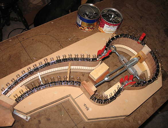 Once that was set, I could start on the kerfing. I put some spreaders in to hold the sides tightly to the mold and raised the rim so that the top edge was about 1/2" over the top of the mold.
