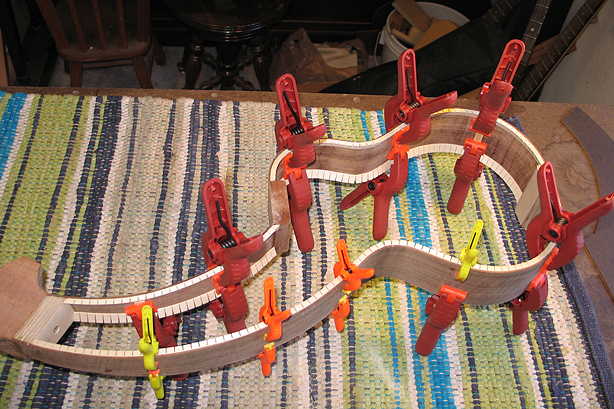 Wednesday, June 15th, 2011: This morning I removed the clamps, and here is the side set, with all its kerfing installed: